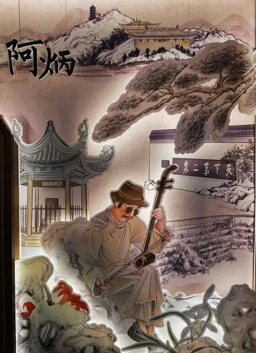 夕阳坠落.西风残照,悲壮的黄昏让人多出几分感慨。忧愁晚景之际,一轮清月,便随西风走进人们的迷朦,四周的幽暗,使无数参差错落的影子复沓成缠绵难舍。蓦然,九天仙子的一滴多情泪,坠入钟灵毓秀的江南,在太湖之畔,种入瞎子阿炳那瘦骨嶙峋的心田,便把这个忧伤的夜成长为一曲千古绵延的绝唱,整个中国,都为之一颤。古泉与新月,在你的手指上跳跃滑行,把满段生命的凄清,潸(山)然泻满一地。月色如泉,泉如月色,两腿如弦孱弱瘦小的阿炳,独自蜷伏,把倒曳的人影倾诉成柔柔的琼浆,飘零成星星点灯的梦幻。那泪水涟涟的曲子,把小城浸得湿漉漉的;凄清的音符,踩在两弦夹着的江南小巷,竟溅起了汩汩热泪,让心魂的蹒跚挽留了太多太多无奈的悲怆。最后,两行冷泪从眼窝里溢出,被岁月之手搓成两根闪烁寒意的冷弦。是啊,两根弦,一根抖动着爱,一根抖动着恨。这世上再没有牵挂的人也不愿再目睹人世间太多的罪恶和苦难,于是一把如月的胡琴结成辛酸的黑暗。冷月清泉,隐约刻印出瘦瘠的身影,诗一般的情愫就从恍恍惚惚的弓影中荡漾开来。其实,你驼着的背,已经弯成了一把不愿沉默的弓,用嘶哑的琴声把江南古城弹奏得淋漓尽致。